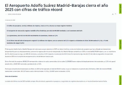 El Aeropuerto Adolfo Suárez Madrid-Barajas cierra el año 2025 con cifras de tráfico récord