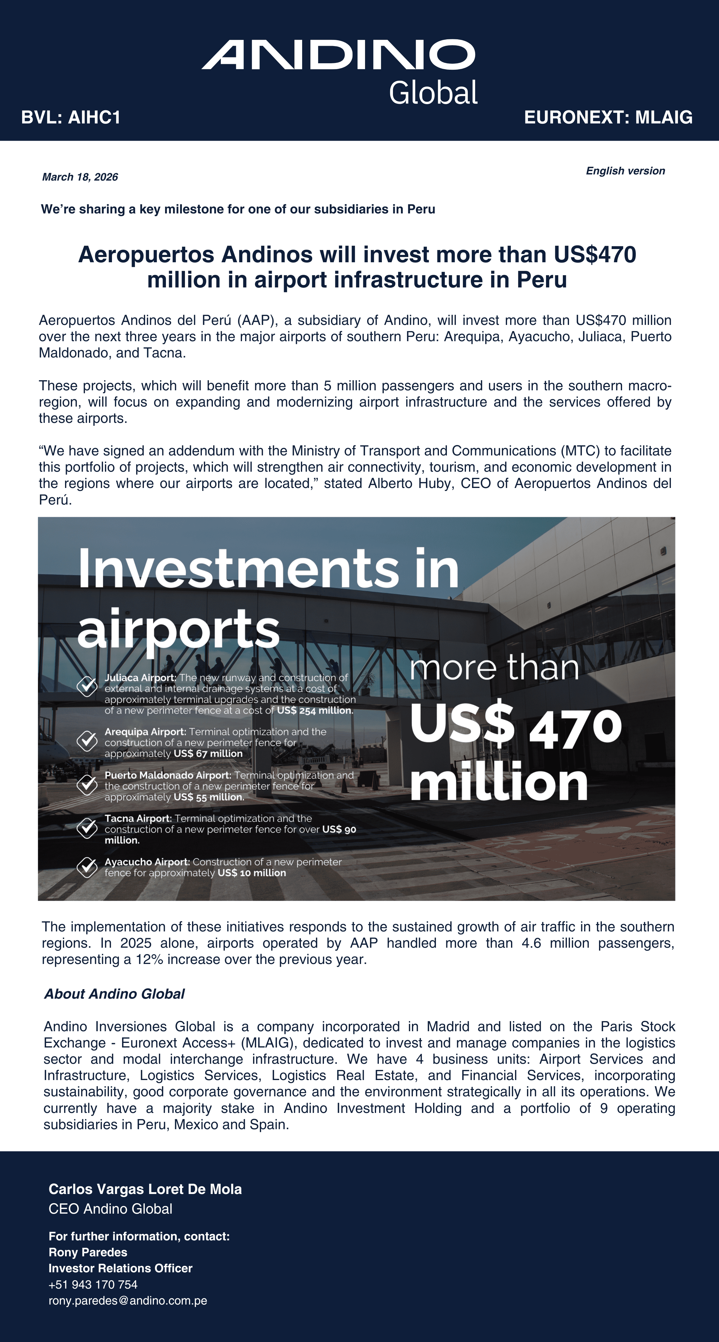 Aeropuertos Andinos will invest more than US$470 million in airport infrastructure in Peru