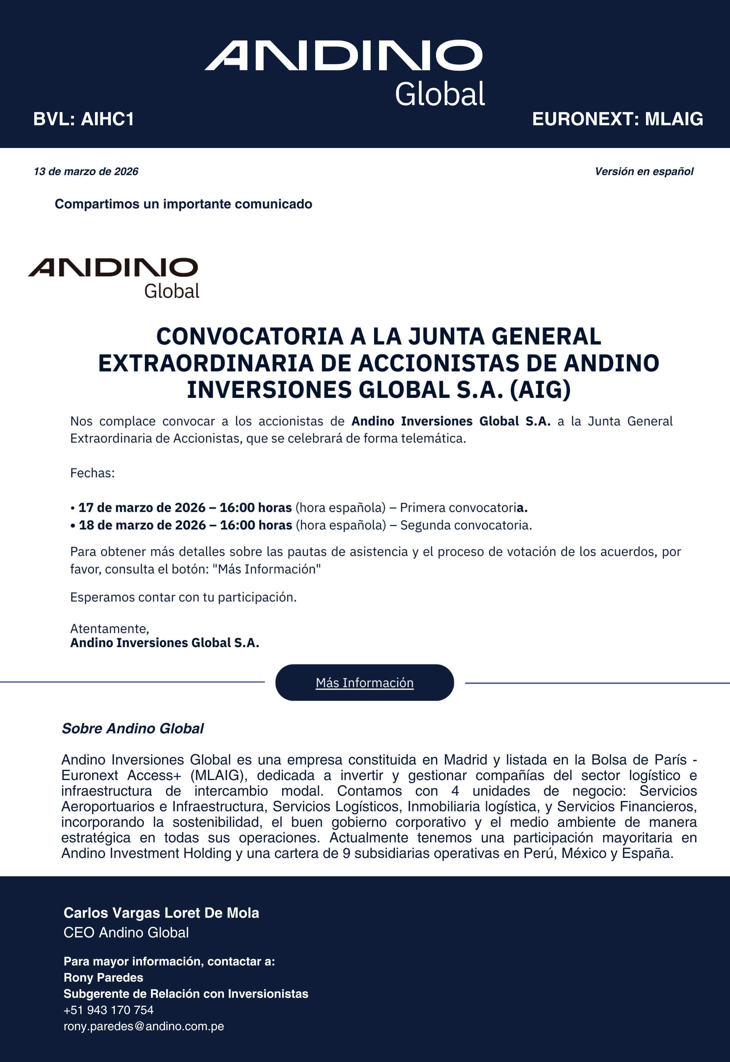 Convocatoria a la Junta General Extraordinaria de Accionistas de Andino Inversiones Global S.A. (AIG)