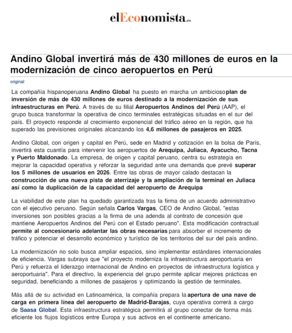 Andino Global invertirá más de 430 millones de euros en la modernización de cinco aeropuertos en Perú.
