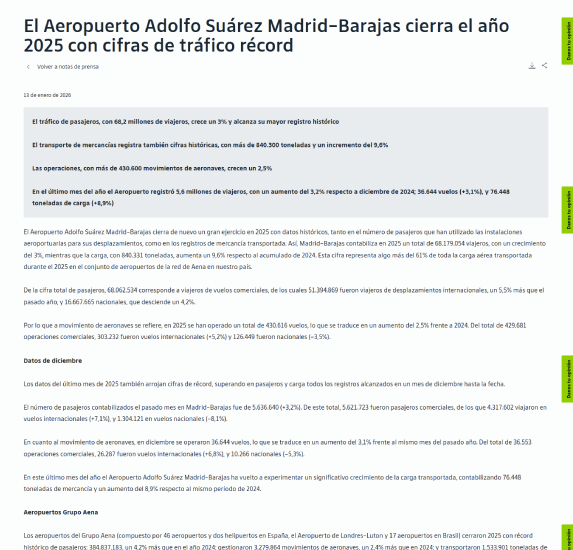 El Aeropuerto Adolfo Suárez Madrid-Barajas cierra el año 2025 con cifras de tráfico récord