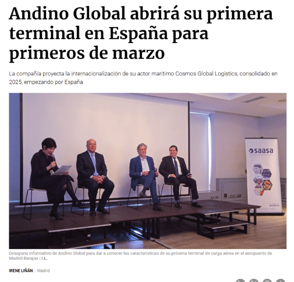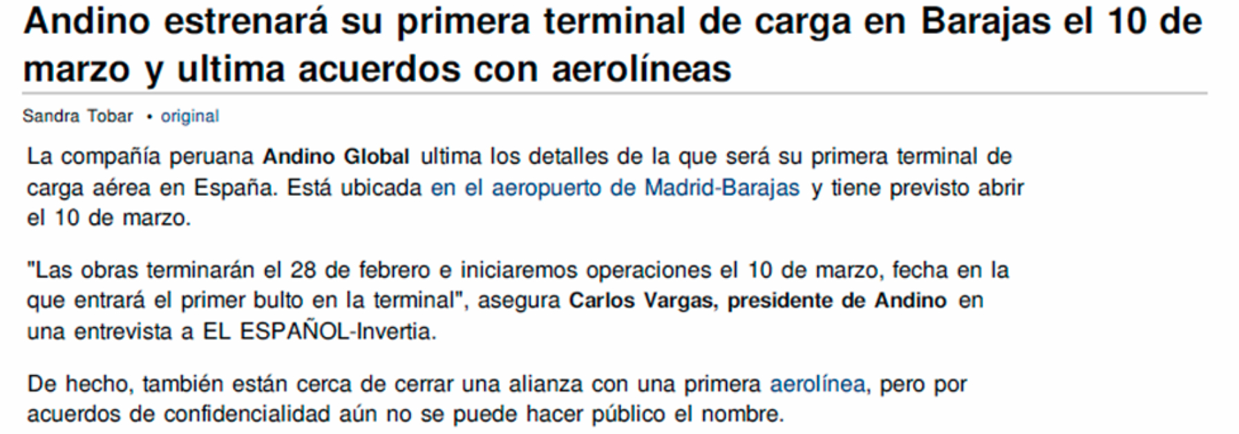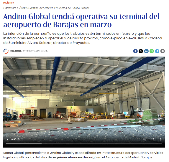 Andino estrenará su primera terminal de carga en Barajas el 10 de marzo y ultima acuerdos con aerolíneas.