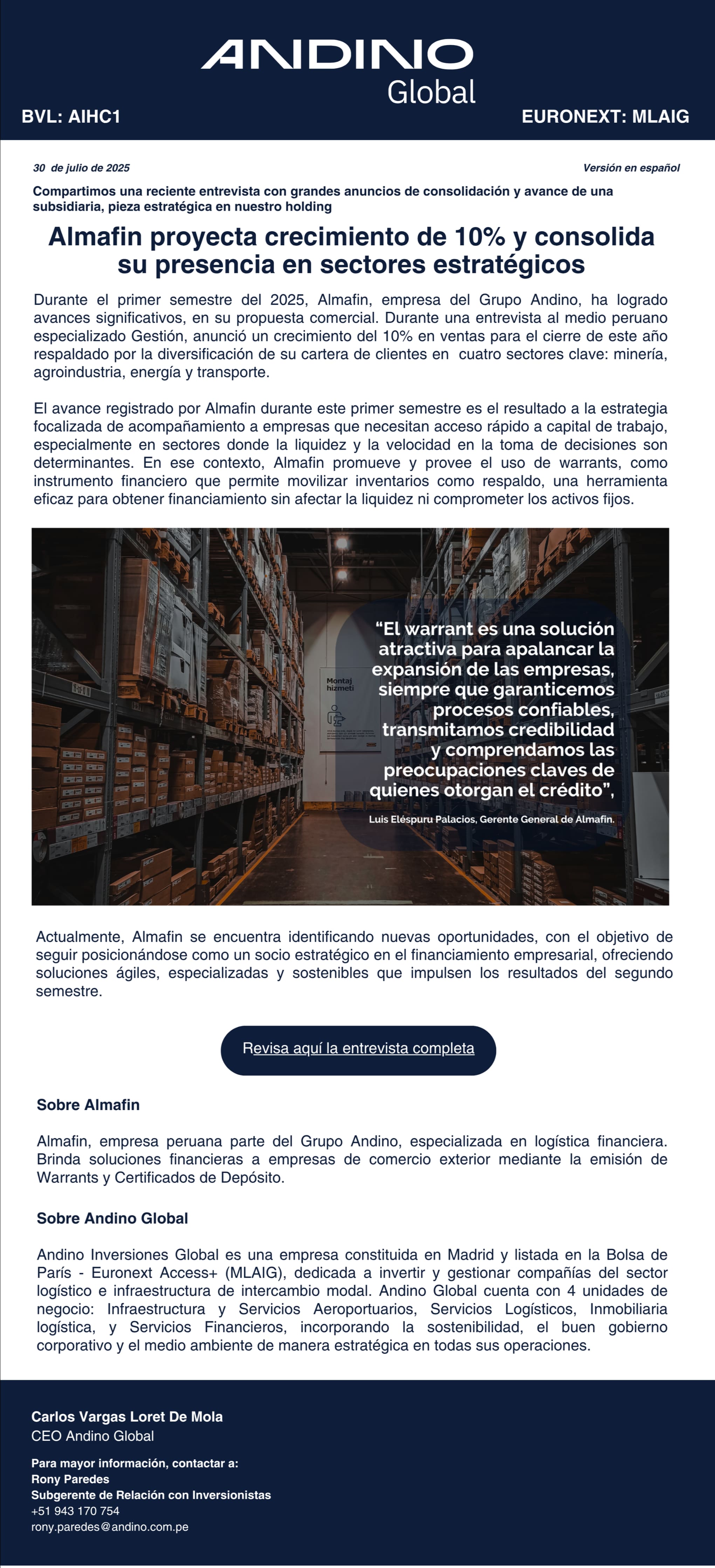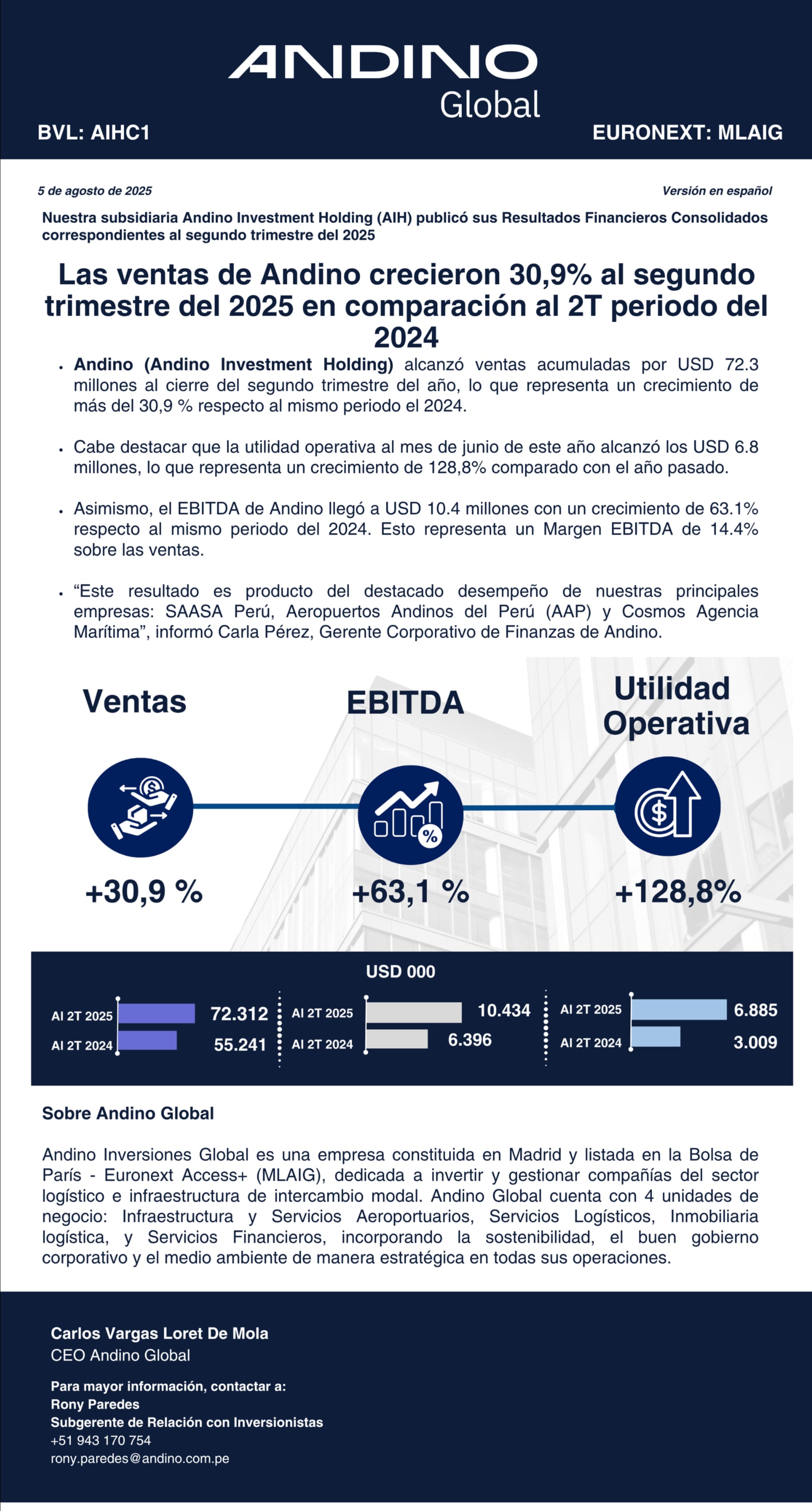 5 de Agosto del 2025 Las ventas de Andino crecieron 30,9% en el 2T 2025 frente al 2T 2024. Descargar newsletter