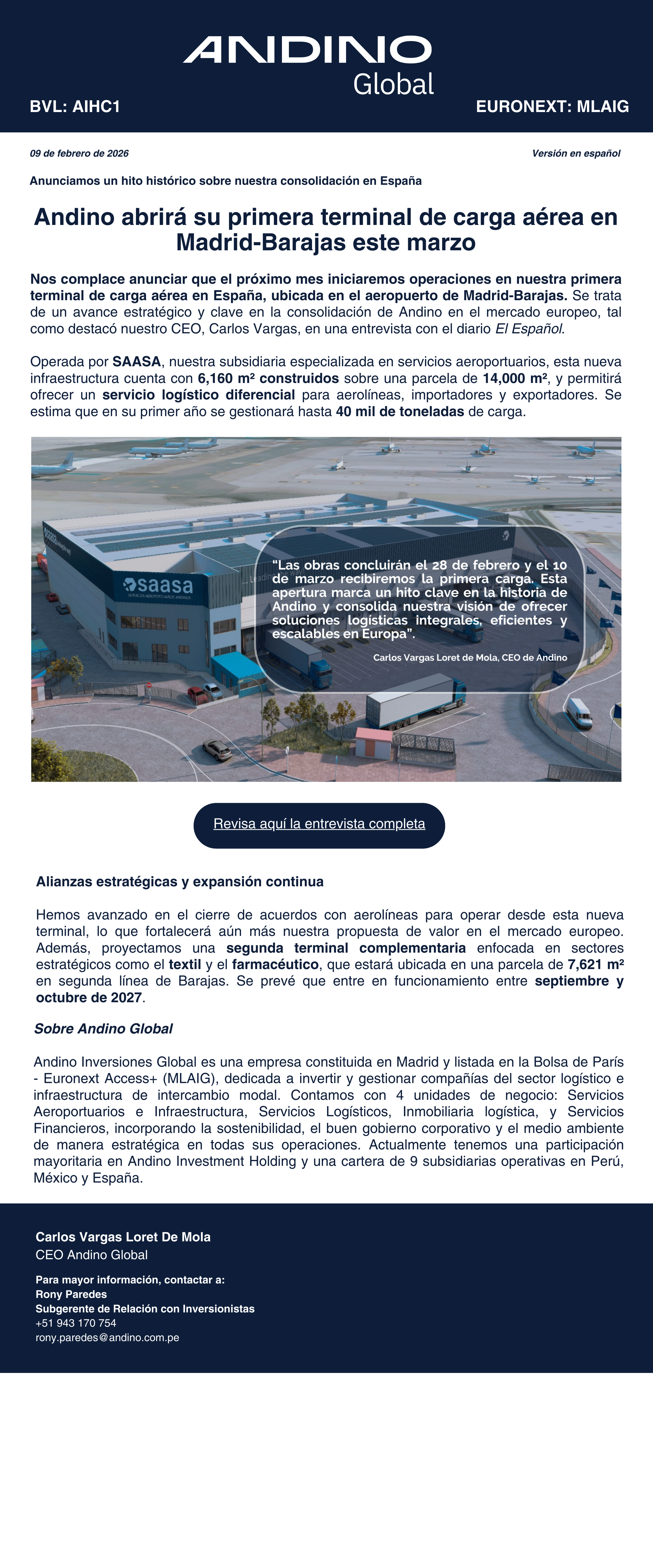 Andino abrirá su primer terminal de carga aerea en Madrid - Barajas este marzo