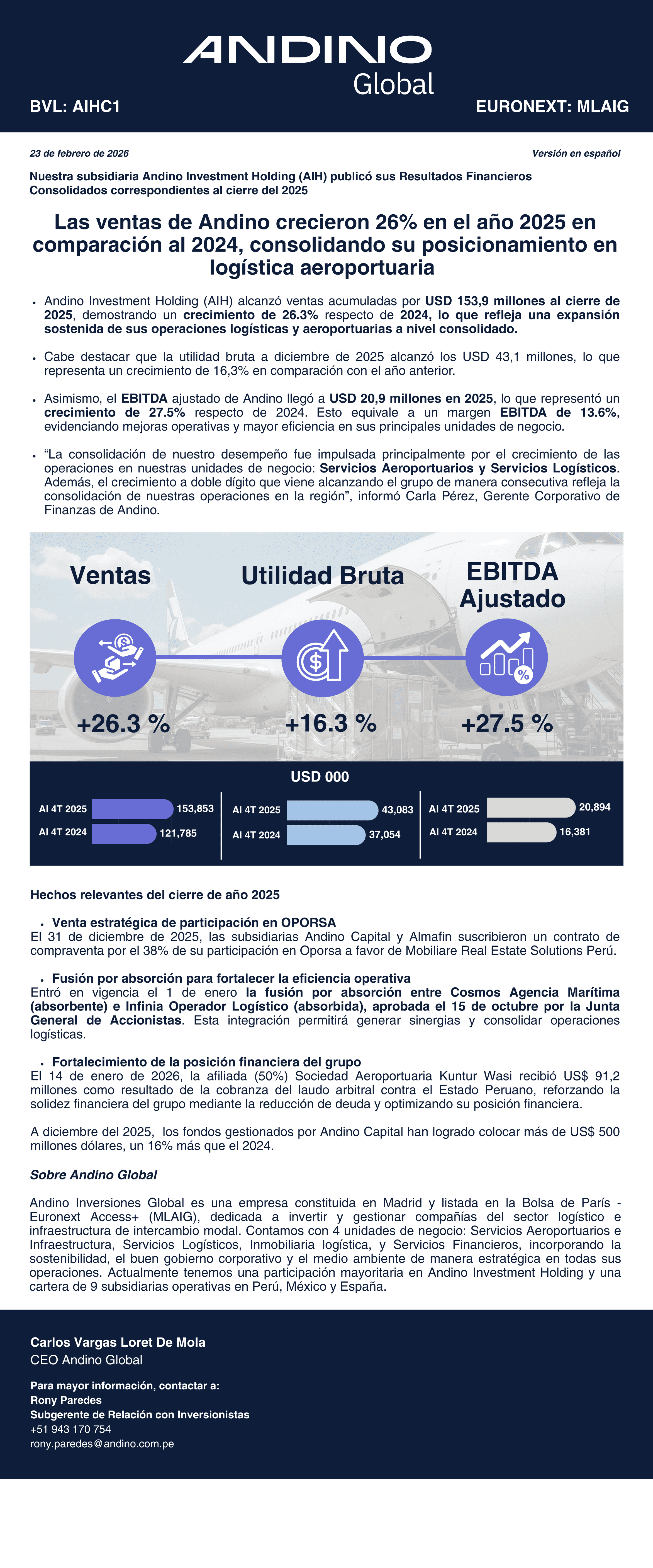 Las ventas de Andino crecieron 26% en el año 2025 en comparación al 2024, consolidando su posicionamiento en logística aeroportuaria