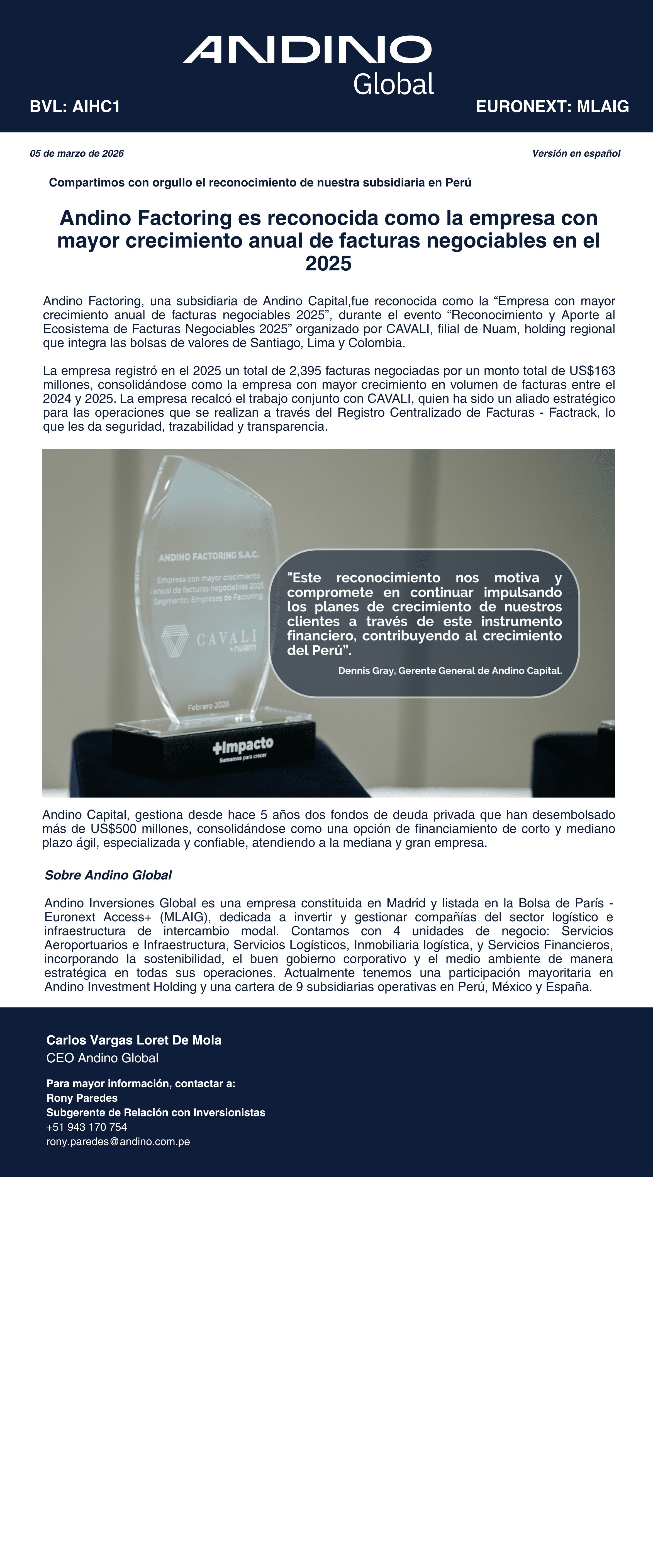 Andino Factoring es reconocida como la empresa con mayor crecimiento anual de facturas negociables en el 2025