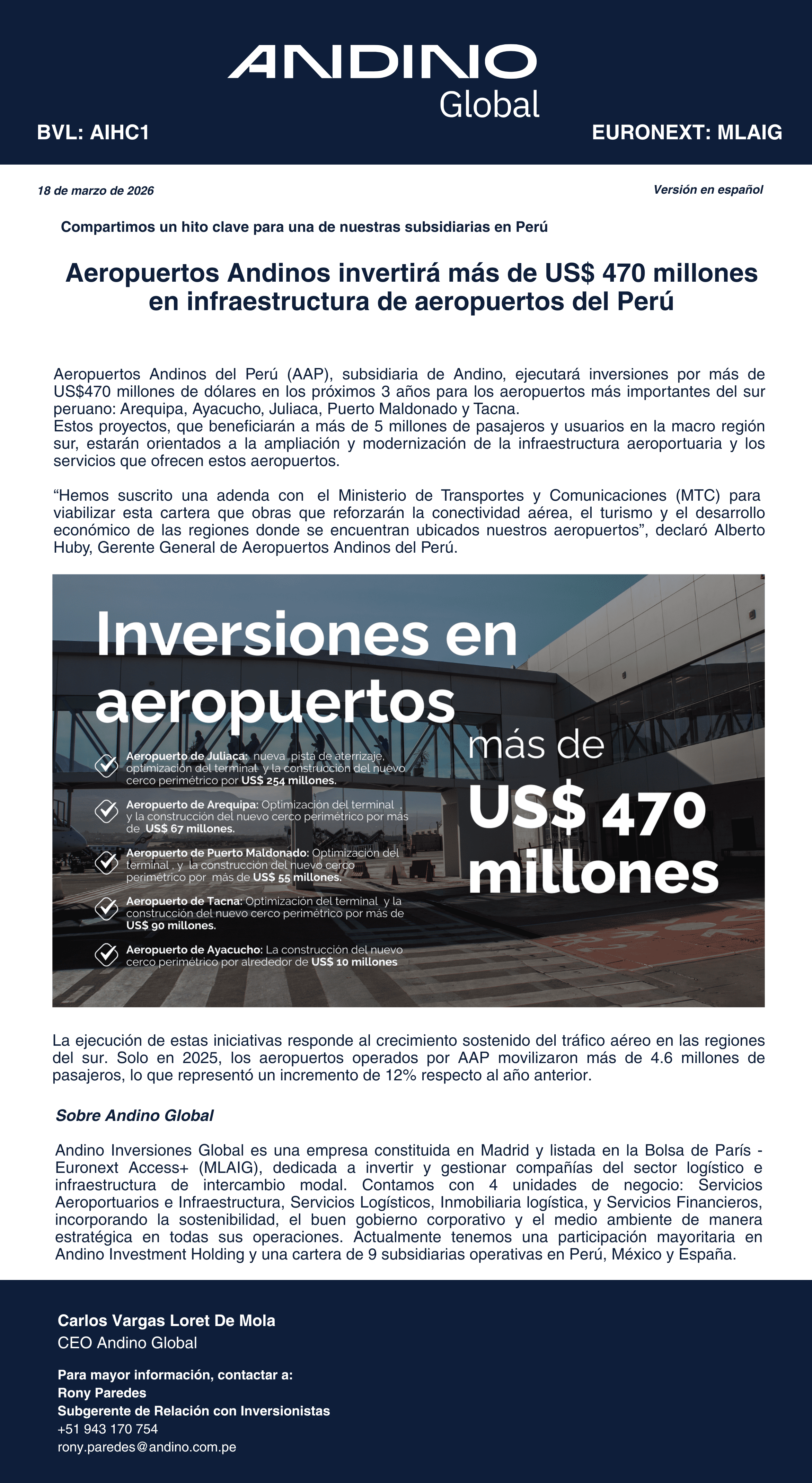 Aeropuertos Andinos Invertirá más de US$ 470 millones en infraestructura de aeropuertos del Perú